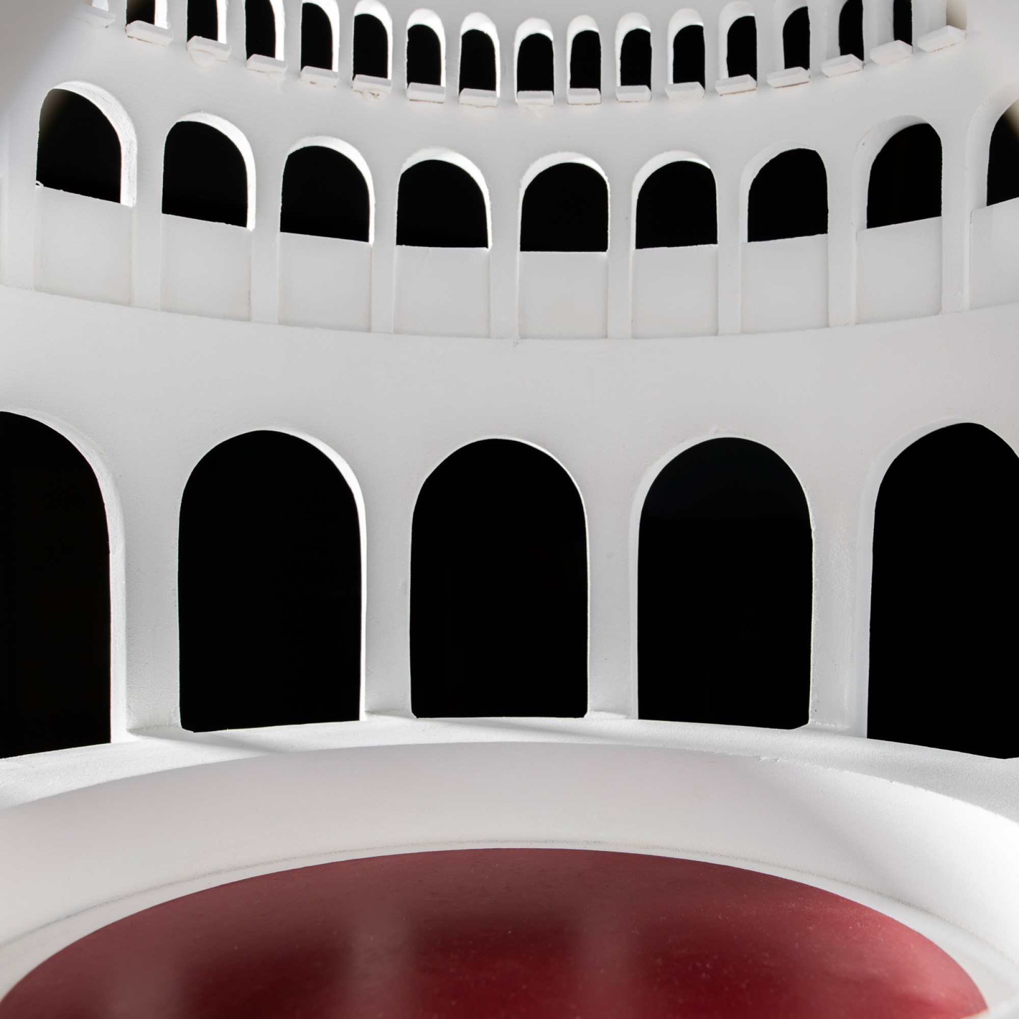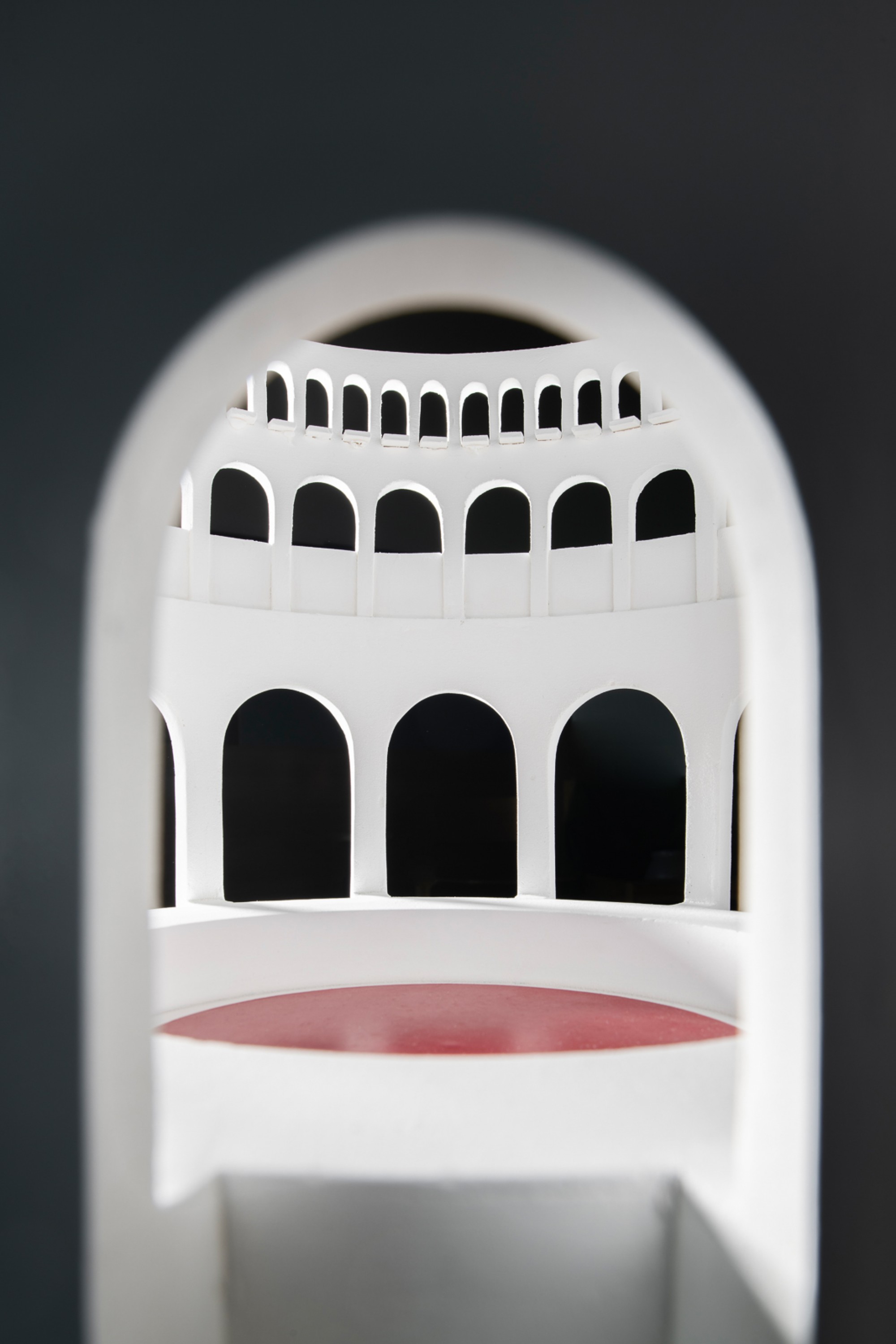 ‘L.arena du monde’ is opgetrokken uit een halve, drijvende bol en heeft zoals een klassieke arena verschillende rijen rondbogen boven elkaar. Onderaan zijn er veertien rondbogen, die de veertien inspirerende verhalen verbeelden van waaruit de L.Arena-droom tot stand kwam. Voor iedere deelnemer is er één boog om aan te meren, van waaruit je het spektakel kan gadeslaan en waarlangs je de arena kan binnenwandelen naar het rode tapijt en actie nemen. De rijen daarboven verdubbelen zich telkens als beeld voor de inspirerende werking van de plek. De tweede rij is als een reeks balkons opgevat en de derde rij als een reeks springplanken.